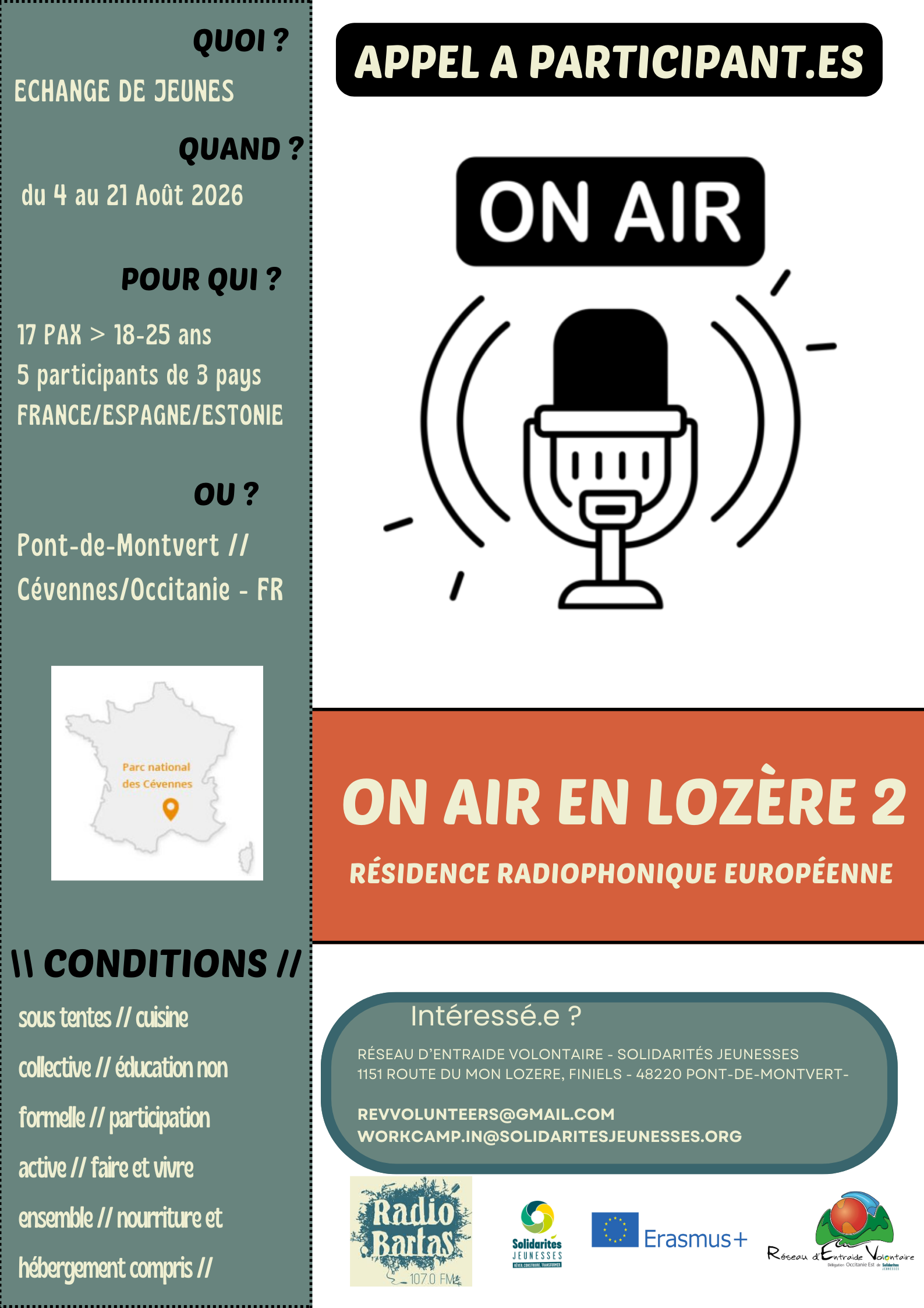Projet : Le projet « On Air en Lozère 2 » est la reconduction d’une résidence radiophonique européenne pour de jeunes créateurs âgés de 18 à 25 ans, organisée en collaboration avec trois associations locales, REV, Radio Bartas et 48FM. L'objectif du programme est d'offrir une expérience immersive dans les médias radiophoniques, tout en promouvant la collaboration interculturelle entre les jeunes Européens. Pendant une semaine, les participants bénéficieront d'ateliers techniques, de formations pratiques et d'émissions en direct, avec une forte intégration dans la communauté locale de Lozère. L'objectif est de leur permettre de développer des compétences radiophoniques avancées tout en créant des contenus qui reflètent les réalités et les enjeux locaux et internationaux. L'autre partie du projet sera consacrée à la mise en place de la vie associative et à l'évaluation individuelle et collective du projet par des méthodes d'éducation populaire.