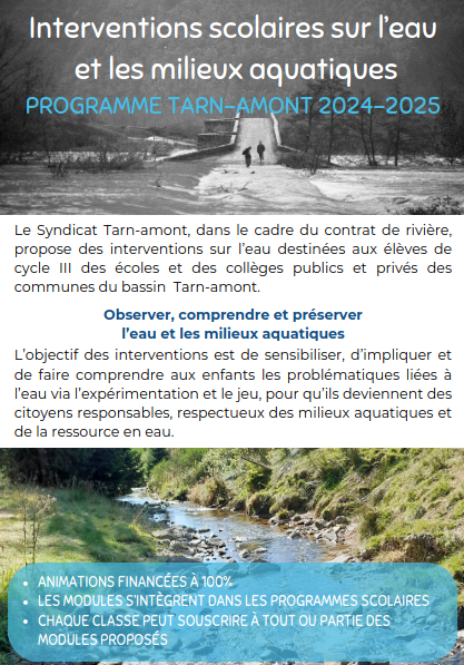 Le Syndicat Tarn-amont, dans le cadre du contrat de rivière, propose des interventions sur l’eau destinées aux élèves de cycle III des écoles et des collèges publics et privés des communes du bassin Tarn-amont. Observer, comprendre et préserver l’eau et les milieux aquatiques L’objectif des interventions est de sensibiliser, d’impliquer et de faire comprendre aux enfants les problématiques liées à l’eau via l’expérimentation et le jeu, pour qu’ils deviennent des citoyens responsables, respectueux des milieux aquatiques et de la ressource en eau.