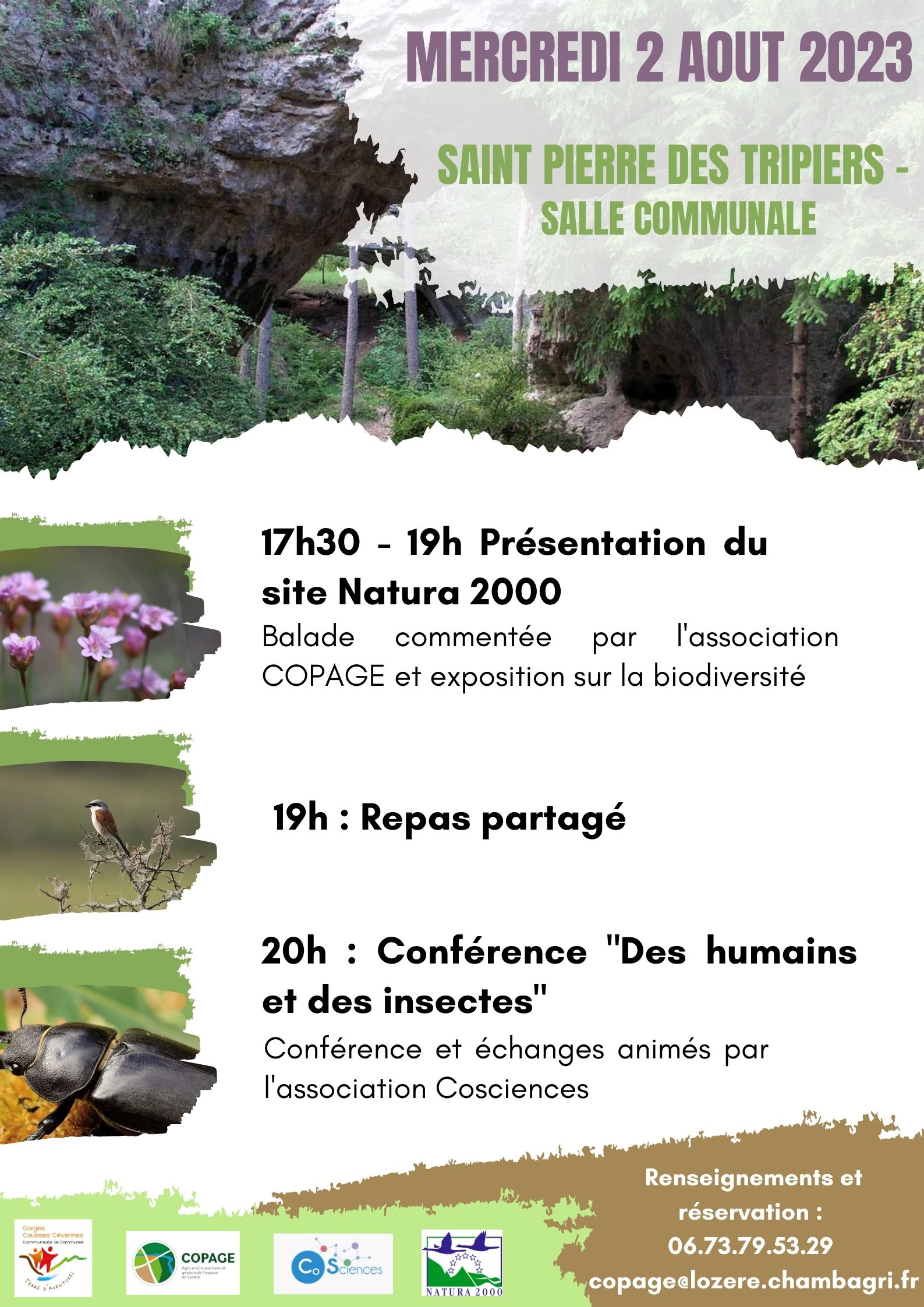 Une balade commentée partira à 17h30 de la salle communale de Saint Pierre des Tripiers où vous pourrez découvrir une exposition sur la biodiversité. La soirée se poursuivra par un repas partagé et la conférence « Des humains et des insectes » par l’association Cosciences.