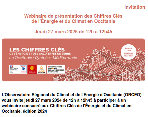 L'Observatoire Régional du Climat et de l'Énergie d'Occitanie (ORCEO) vous invite jeudi 27 mars 2024 de 12h à 12h45 à participer à un webinaire consacré aux Chiffres Clés de l'Énergie et du Climat en Occitanie, édition 2024.